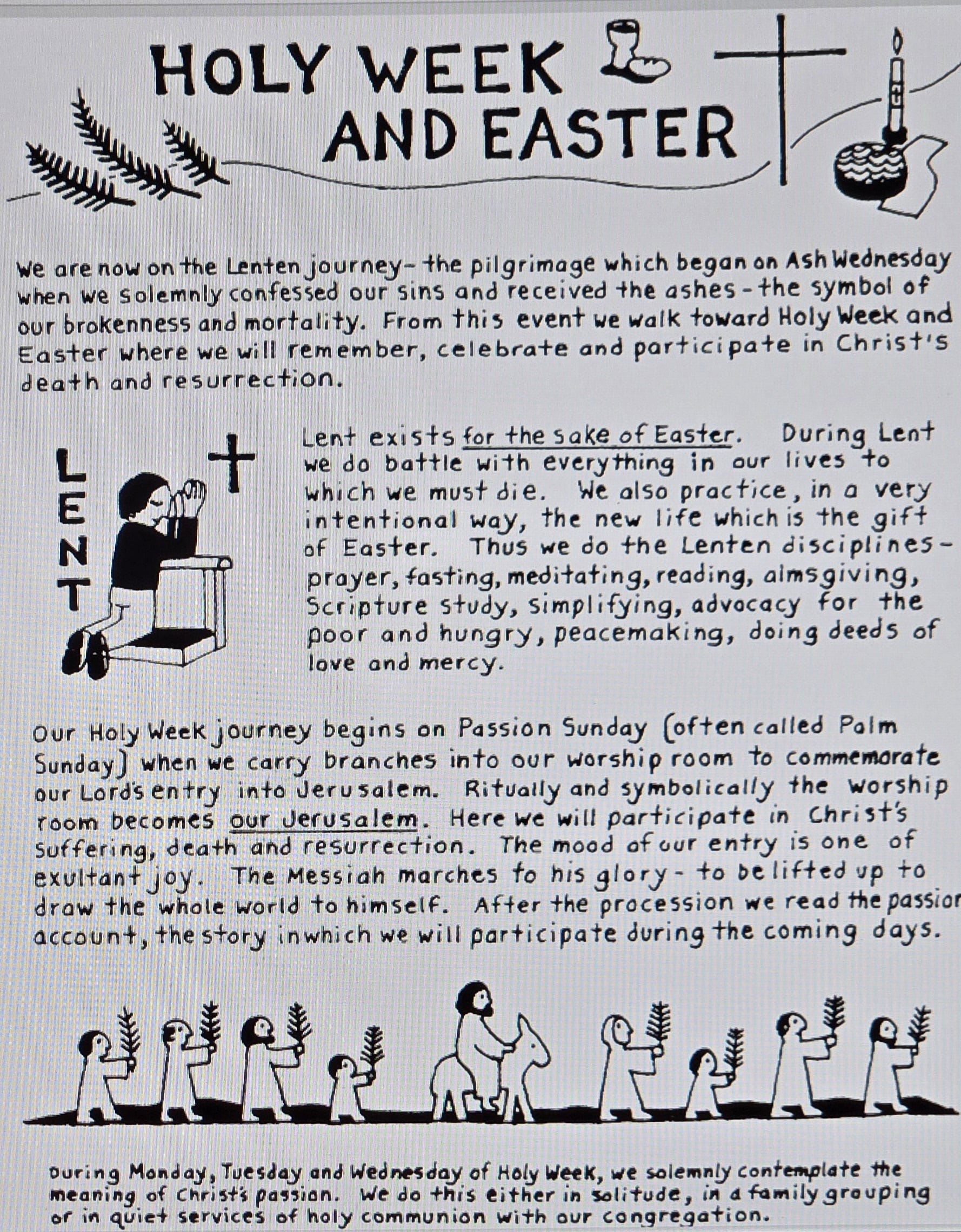 In my last column I wrestled with why interest and involvement in church is declining. One of the reasons I pointed to was the complaint of “irrelevance of religion because of the Biblical focus on ancient times and arcane practices that don’t speak to one’s daily life.” While this may have an element of truth, I believe the rituals and practices of the church’s Liturgical Calendar are intentionally offering people an honest, challenging, and “alternative” way of life in stark contrast to the busy, frantic, and superficial calendar we often practice without evening knowing it. Here’s a link to a delightful explanation in words and pictures by Daniel Erlander of the Lenten/Easter Season.